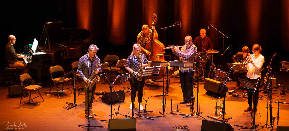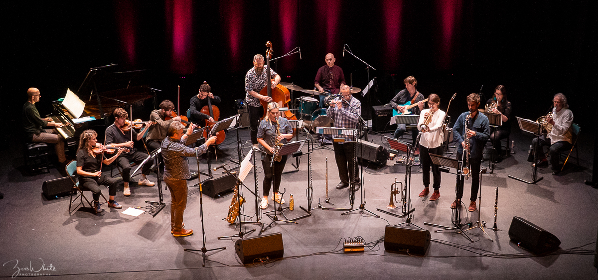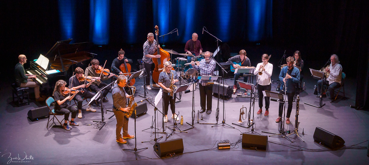 Mark Lockheart tenor saxophone, Alice Leggett alto, Laura Jurd trumpet & flugelhorn, Rowland Sutherland flute & piccolo, Sam Rapley clarinet & bass clarinet, Liam Noble piano, Mike Outram guitar, Tom Herbert bass, Sebastian Rochford drums, Jim Rattigan, Anna Drysdale French horns, Emma Smith, Phil Granell, Richard Jones violins, Sergio Serra cello